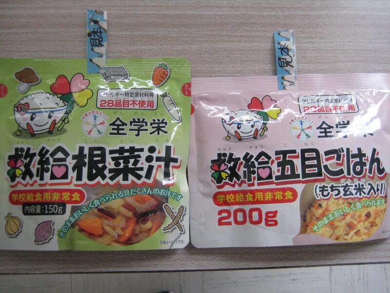 食事訓練では、学級ごとに集まって防災食を食べました。