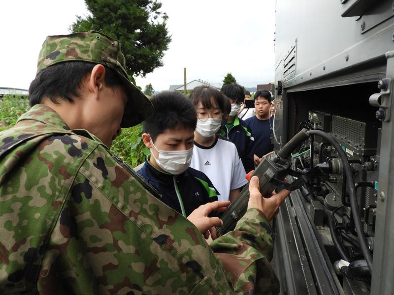 午後は自衛隊旭川地方協力本部の方々にお越しいただき、実際に災害派遣で使用した移動式の入浴施設の体験や、通信装備が搭載された車両を見学させていただきました。