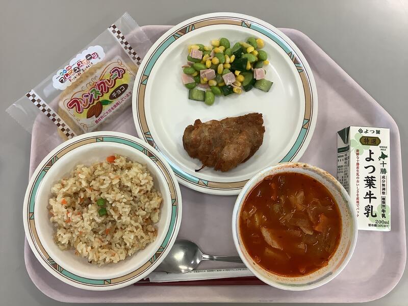 ツナピラフ 牛乳 ミネストローネ タンドリーチキン サイコロサラダ チョコクレープです。